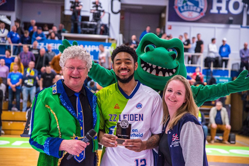 De atletische Amerikaan werd zaterdagavond 19 maart voorafgaand aan het duel tegen Stella Artois Leuven Bears in het zonnetje gezet. Uit handen van Nienke de Ligny van De Blauwe Brigade kreeg hij de Speler van de Maand-trofee, gemaakt door awardguru.nl.